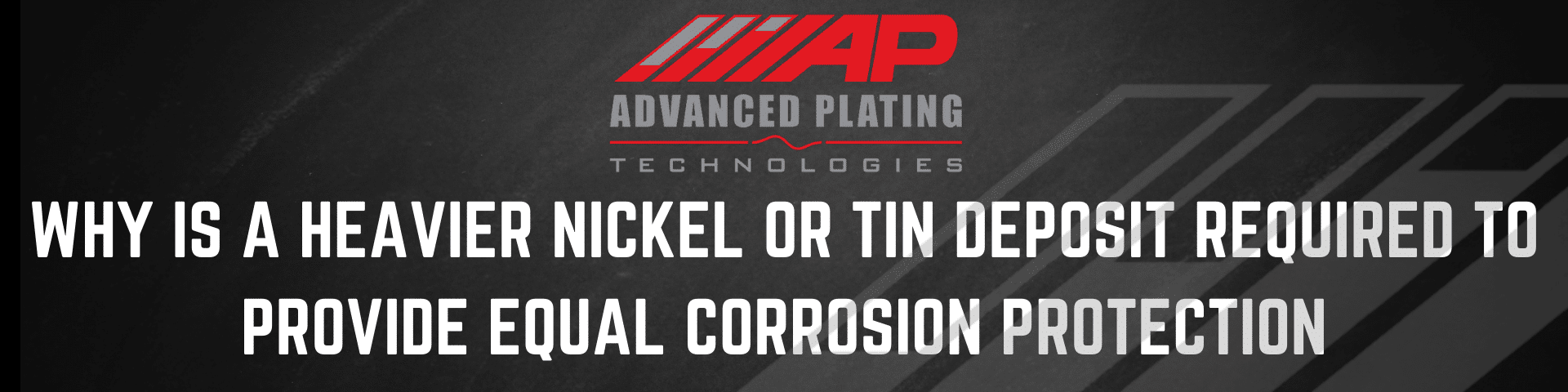 The amount of nickel or tin that is required to achieve a certain level of corrosion protection is very much a function of the surface finish (smoothness, burrs, pits, etc..) of the substrate. A smooth surface will require less nickel or tin to achieve good corrosion protection as compared to a rough, pitted surface with edge burrs. However, a good general guideline is that “good” corrosion protection begins around 0.0005 inches (20um) of nickel or tin and “excellent” corrosion protection occurs around 0.001 inches (50um) on reasonable substrates. This is very different from an anodic coating such as zinc where the surface condition will not play as large of a role in the overall corrosion performance. In addition, thinner coatings of zinc on steel can afford better corrosion resistance than tin or nickel since zinc coatings do not have to seal the surface to provide scarification corrosion protection.