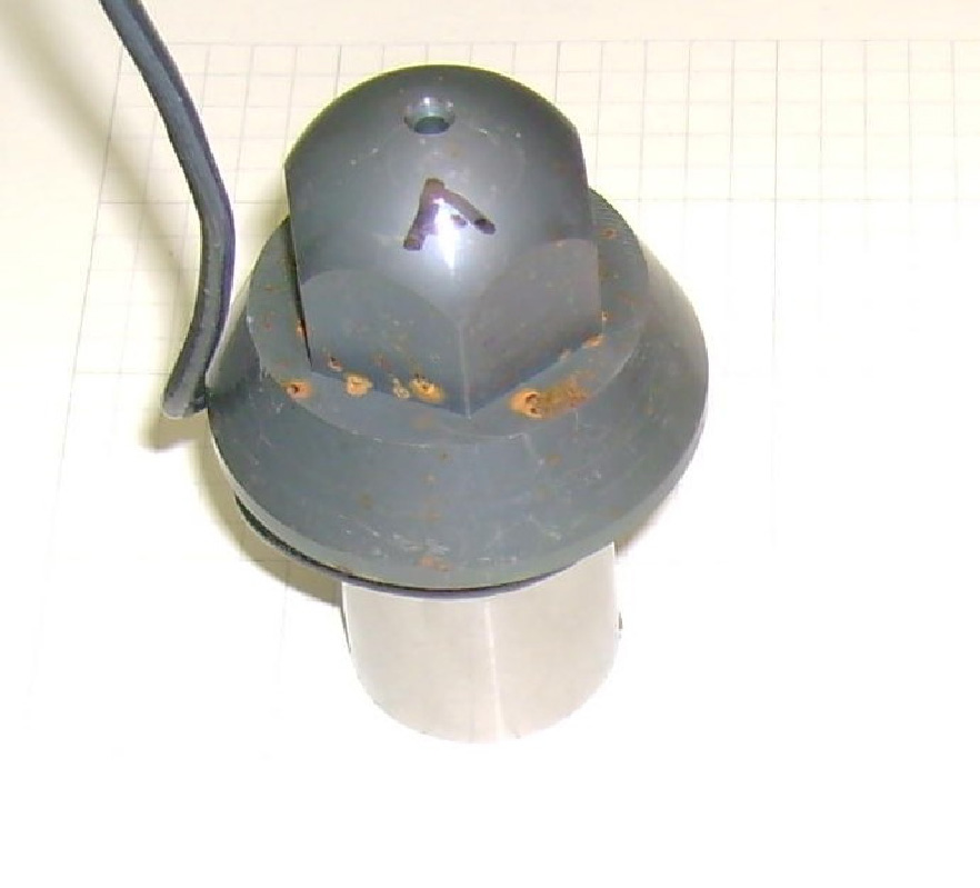 F.2: Improperly Passivated 416SS Stainless Component Showing Red Rust After High Humidity Testing on Hex Head Portion with Residual Heat Treat Scale While Not on Clean Shaft Portion