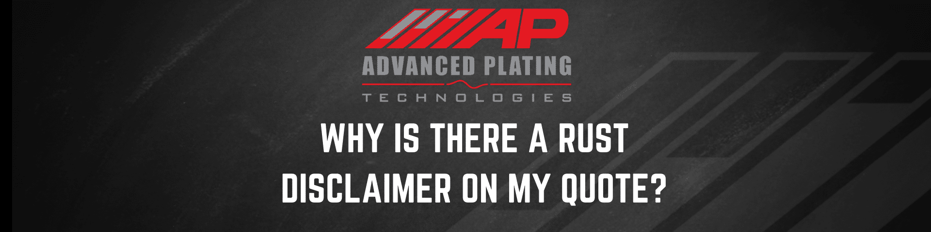 The environment in which commercially plated parts are stored can have a significant impact on if visible rust will occur on the surface. For example commercial deposits on ferrous products which are plated and inventoried in dry environments – such as a Midwest warehouse in January – will have very different results when plated and inventoried in the same warehouse during hot, humid summer months. Since Advanced Plating Technologies can not control the use or application of commercial deposits, a disclaimer is typically added to the quote warning of the corrosion limitations of the commercial deposit.