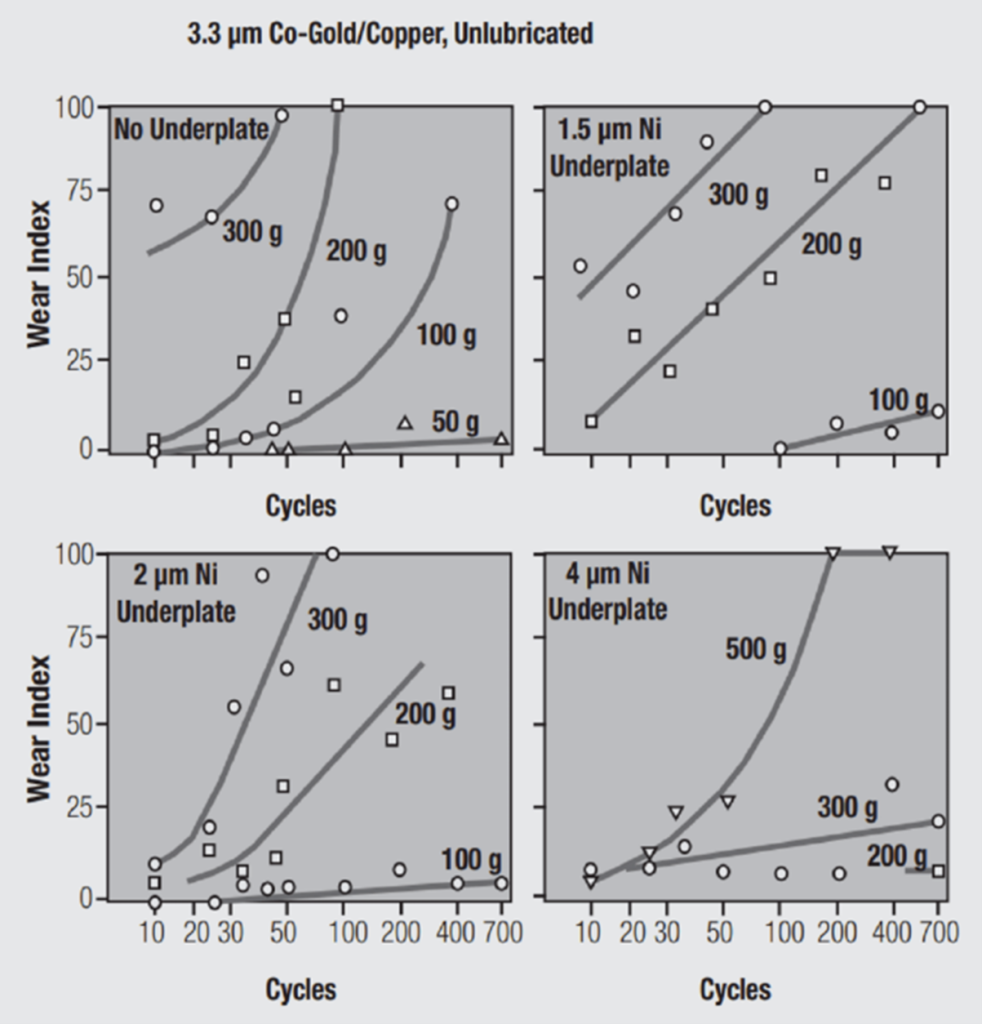 Figure 2: Impact of Nickel Underplate on Hard Gold for Wear Protection at Different Contact Pressures and Underplate Thicknesses