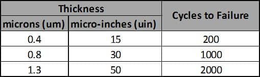 If an application requires repeated sliding wear or make/break switching events, hard gold should be specified. The number of life cycles is proportional to the thickness of the gold since a thicker gold deposit will be able to withstand more cycles. Common thicknesses of functional hard gold deposits range from 0.000015 inches for very low cycle applications up to 0.0001 inches for very high cycle applications with the most common thicknesses ranging between 0.000035 inches to 0.000075 inches.
