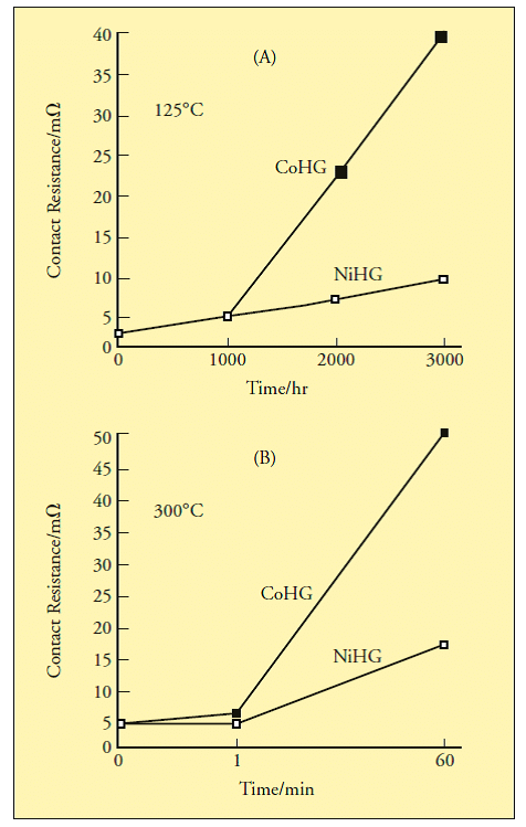 Figure 1 illustrates the increase in contact resistance for both cobalt hardened gold (CoHG) and nickel hardened gold (NiHG) as a function of both temperature and time. The increased contact resistance of CoHG over time is believed to be due to the increased contact resistance of cobalt oxide as opposed to nickel oxide.