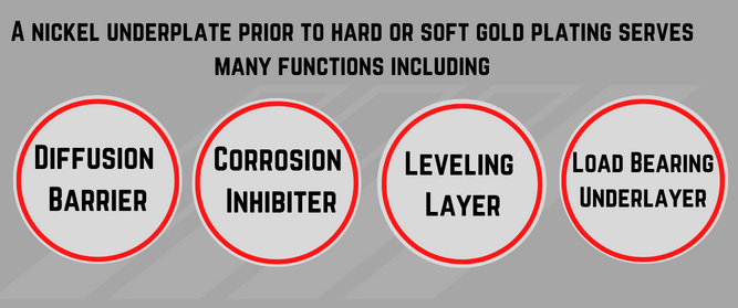 - Load Bearing Underlayer: A nickel underplate serves helps bear the contact load of a hard or soft gold plated component. This reduces the potential for cracking of hard gold plated contacts and promotes overall wear resistance.