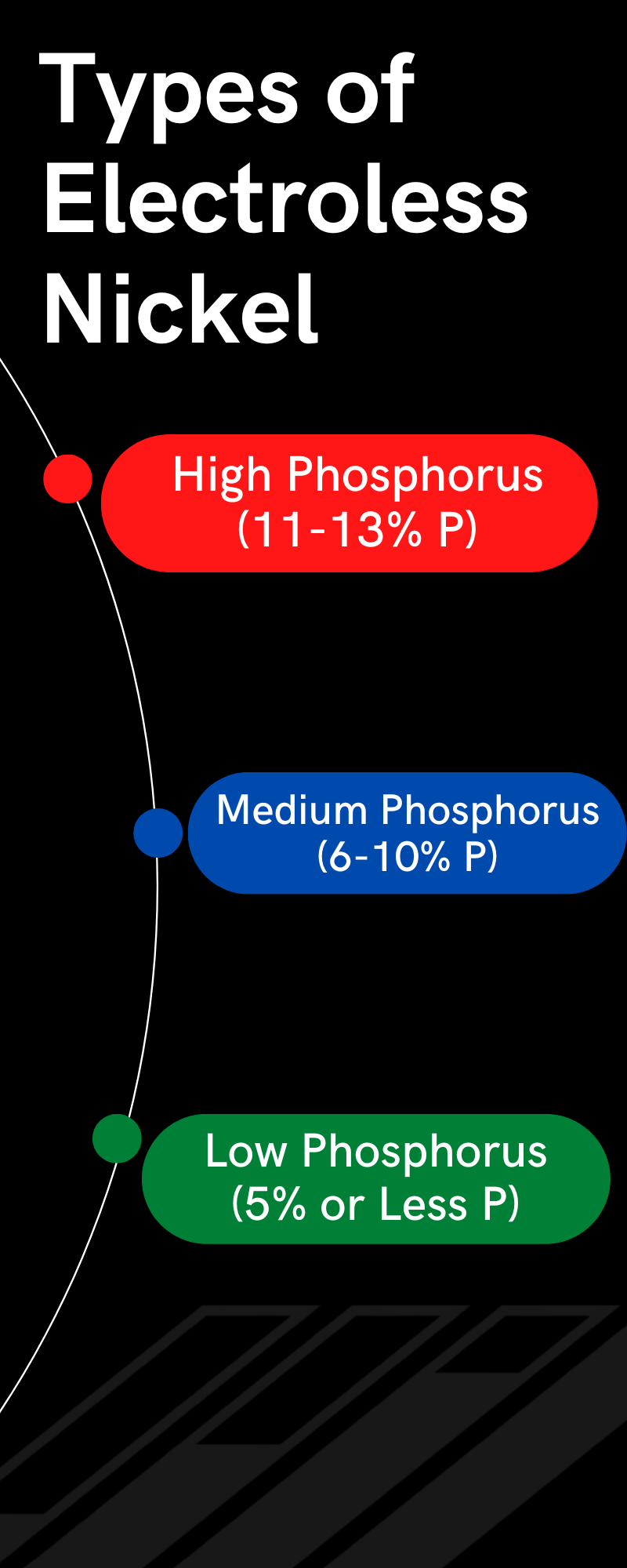 Traditional electroless nickel phosphorus plating is broken down into three specific groups, 1) low phosphorus (<5% P), medium phosphorus (6-10% P) and high phosphorus (11-13% P). Depending upon design considerations and the corrosion performance required, the phosphorus level and deposit thickness can be adjusted accordingly. Advanced Plating Technologies offers both medium phosphorus electroless nickel plating and high phosphorus ENP. A breakdown of each EN type is provided below: