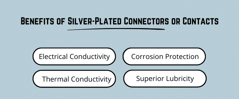 Silver maintains outstanding lubricity even under extreme temperature conditions. It can be ideal for high-temperature threaded or sliding silver electrical contacts where galling may be a concern. For applications requiring even greater wear resistance, pairing silver with a lubricious underplate, such as electroless nickel, significantly improves the overall mechanical performance and longevity of the connector.