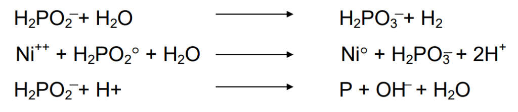 The chemical reactions that occur when using sodium hypophosphite as the reducing agent in electroless nickel plating are as follows: