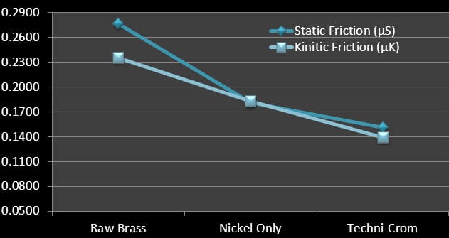 Techni-crom™ provides a proprietary dry-film technology that reduces both static (resting) and dynamic (sliding) coefficients of friction by over 40% compared to a standard brass casing when tested by an independent metallurgical testing lab*.