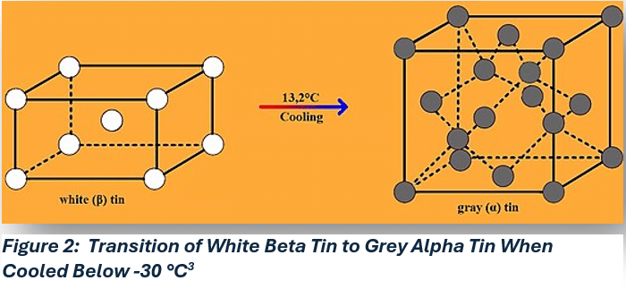 phase that is not conductive. This transition is slow to occur at normal temperatures but at very low temperatures of -30 °C, the transition can initiate and occur rapidly degrading the tin properties.