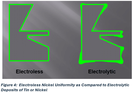Since the mechanism for electroless nickel plating is a chemical reduction rather than an externally applied voltage, electroless nickel deposits plate very uniformly everywhere the part is wetted by the solution provided the solution can be continuously replenished (agitated) at the surface. The uniformity of electroless nickel is a fundamental advantage that allows for tighter manufacturing tolerances as well as heavier deposits that provide improved wear and corrosion resistance. Figure 4 provides an illustration of how electroless nickel plates very uniformly without buildup on edges or corners as occurs with electrolytic plating.