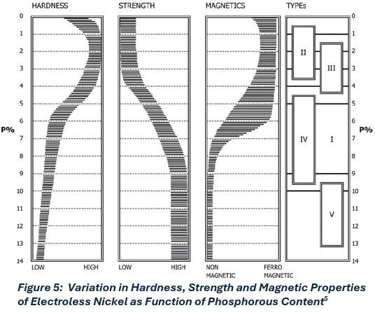 phosphorous within the deposit. Figure 5 is taken from Appendix X5.1 of ASTM B733 and further illustrates how the hardness, strength and even magnetism of nickel phosphorous coatings vary with increasing phosphorous content.