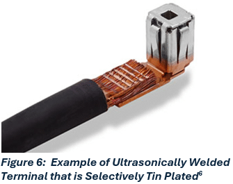 of tin, however, is an issue for USW. During the process the tin will melt cooling the interface and preventing full diffusion from occurring. As such, any tin plated terminal must be selectively plated to avoid plating of the weld zone. This selective plating requirement can add significant cost especially for loose plating methods such as rack and barrel plating. This limitation of tin plating is a major disadvantage as compared to nickel plating of terminals or bus components that will be jointed using USW.