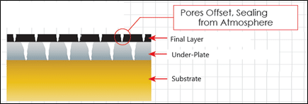 Each plated layer has a unique porosity similar to a fingerprint, as more layers are added it is less likely for the pores to reach the base material. This is due to the fact that pores are concentrated at the grain boundaries and each plated layer has a unique grains structure. Adding layers adds the complexity of the path from the substrate to the surface for a continuous pore to exist.